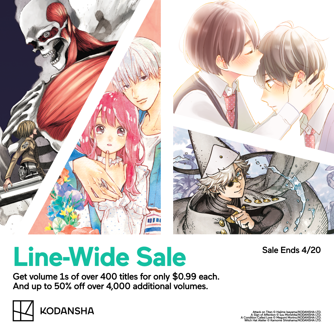 Our Kodansha Line‑Wide Sale features hundreds of series at$0.99 for Vol.1 and up to 50% off select volumes.